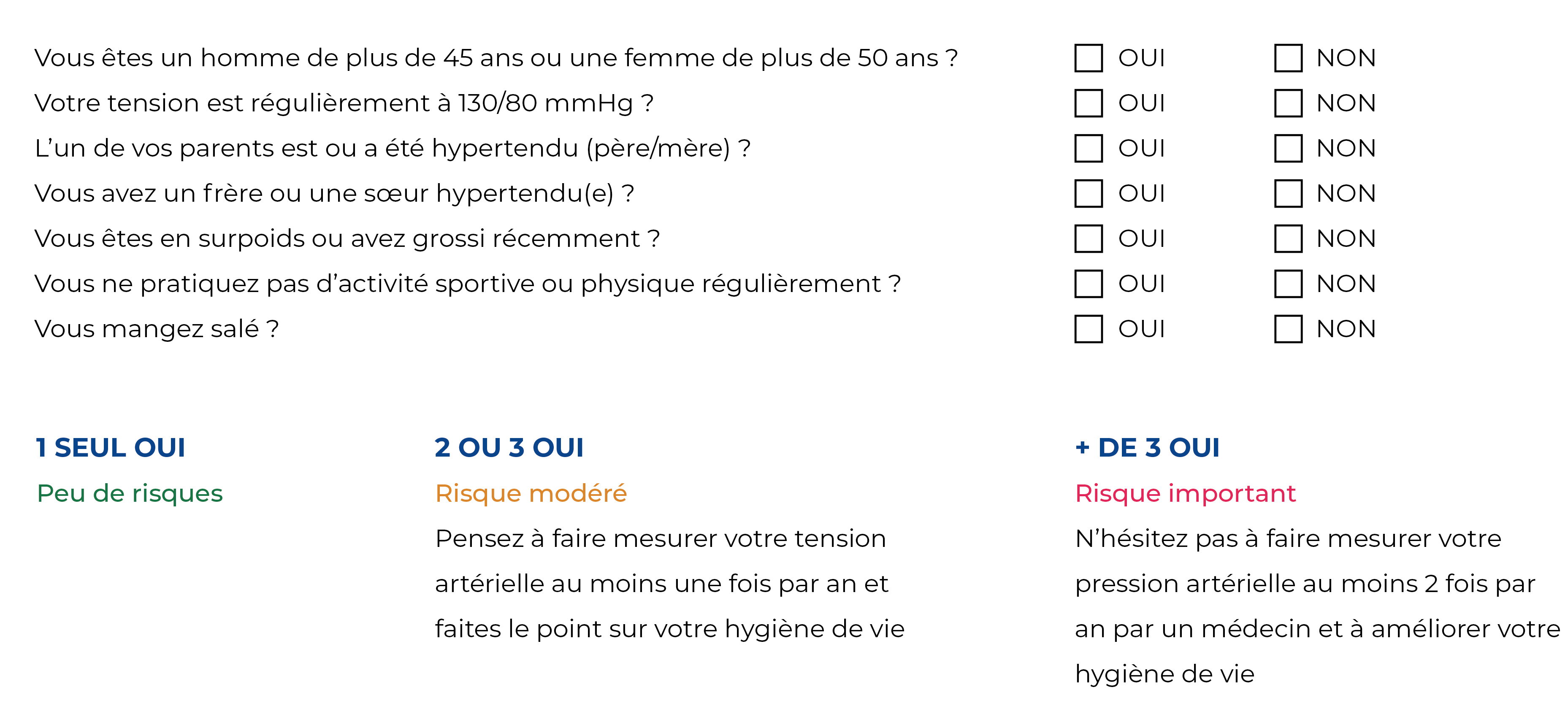 Nous vous proposons un petit questionnaire qui vous permettra d’évaluer vous-même votre risque d’être hypertendu [2]. Attention, ce questionnaire ne se substitue pas à un avis médical et ne constitue pas un diagnostic. Pour obtenir un diagnostic, consultez votre médecin :