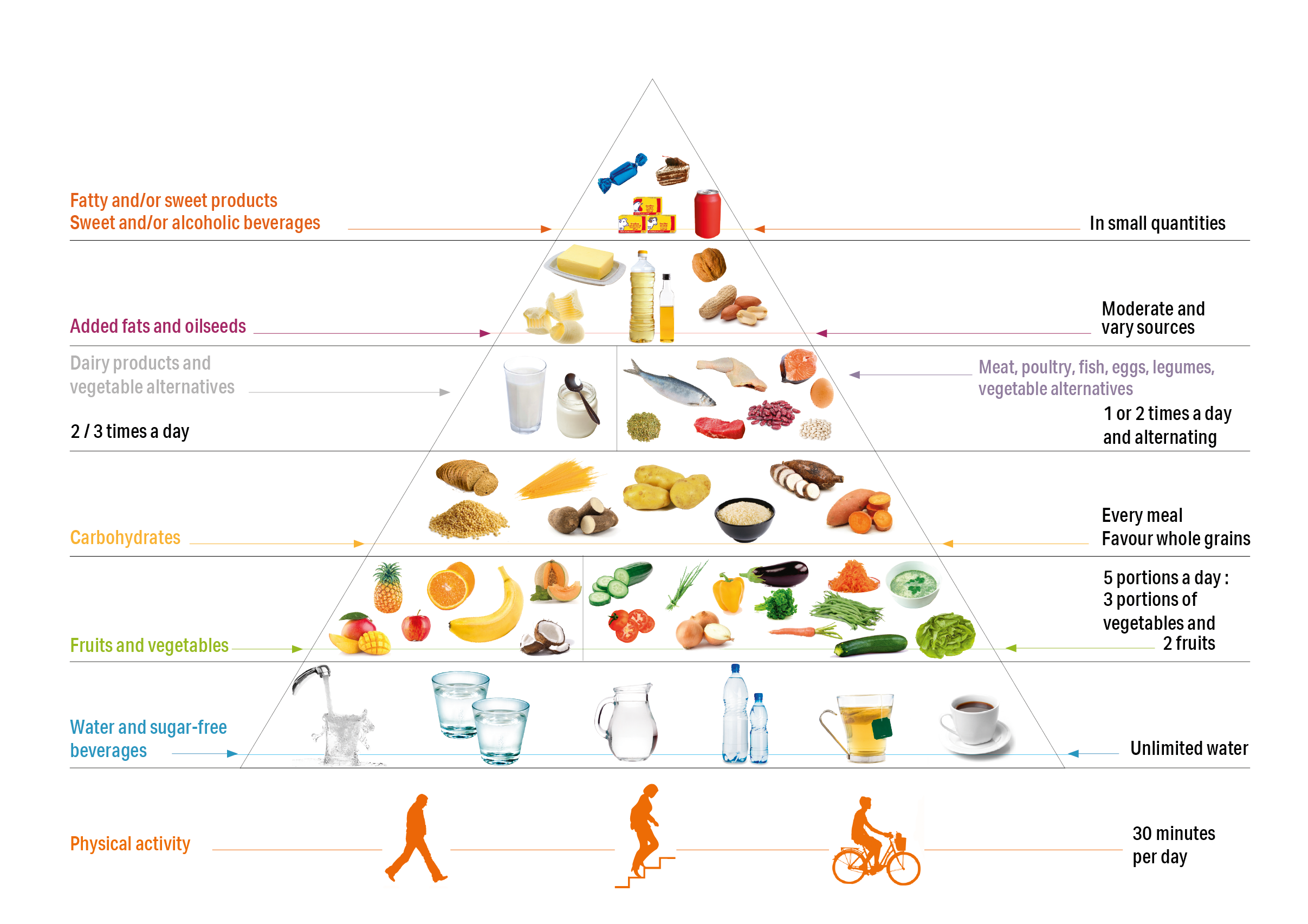 Obesity is one of the main risk factors for hypertension, as is excessive consumption of alcohol or salty foods (click here for a short reminder of the risk factors). In order to lose weight, it is therefore necessary to introduce changes in your diet and lifestyle that you can maintain over the long term. In other words, it is more a question of introducing new habits into your lifestyle than of following a strict diet. It is essential to set realistic and reasonable goals. In fact, no food is strictly forbidden. However, some foods contain a lot of salt or fat, which can be deposited in the arteries and clog them. If the arteries are clogged, the blood has difficulty passing and the blood pressure increases. It is therefore advisable to comply with the recommendations of the following food pyramid [2].